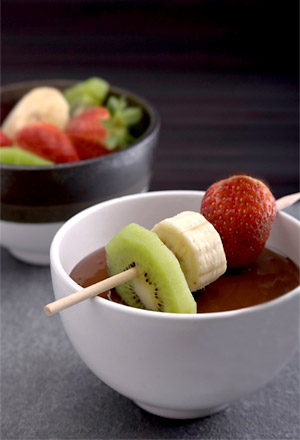 Got chocolate craving? Then you'll love this! Break some bittersweet dark chocolate into small pieces and microwave until melted. Serve with assorted fresh fruits like banana chunks and strawberries. It's a healthy treat as long as you include more fruits and go easy on the chocolate.