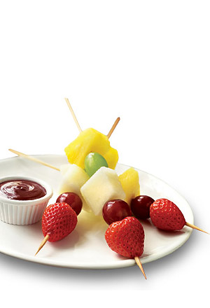 Directions: Thread 1 cup each strawberries, grapes, cut melon and pineapple onto skewers. Melt 1 cup chopped dark chocolate over low heat, stirring frequently, and serve immediately.