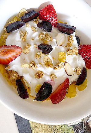 Directions: Spoon 1/2 cup vanilla yogurt into a bowl and top with a mix of fresh and dried fruits, and nuts.