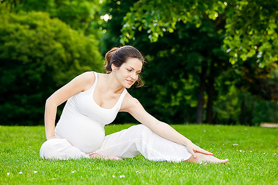 Stretch gently. Ligaments are looser during pregnancy, so intense stretching could cause injury.