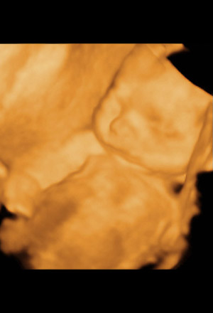 By 20 weeks, the top of the uterus is at the belly button. The baby weighs about 300 grams (10.6 ounces) and about 16 cm (6.5 inches) long, and is covered in a fine hair called lanugo. Fingerprints are developing as well as permanent teeth buds behind the baby teeth that are already formed. Gender is usually visible through ultrasound by now. The baby can suck a thumb, yawn, stretch, and make faces. You may be able to feel your baby move, which is called "quickening." Loud noises may even cause your baby to startle.