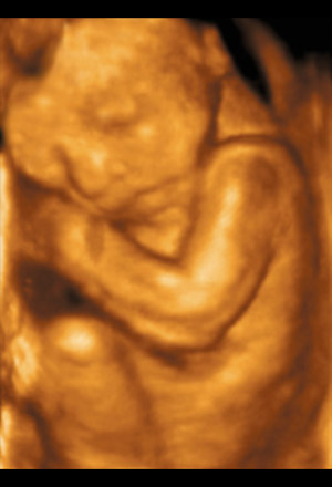 By the sixth month, the baby weighs in at about 0.6 kilogram (1.4 pounds) and 30 cm (11.8 inches) in total length. It can hear your voice, heartbeat and breathing, responds to sounds by moving or increasing its pulse, so now's a great time to start reading and talking to your baby. You may notice jerking motions if it hiccups. The baby is also depositing brown fat, which will help it regulate body temperature at birth.